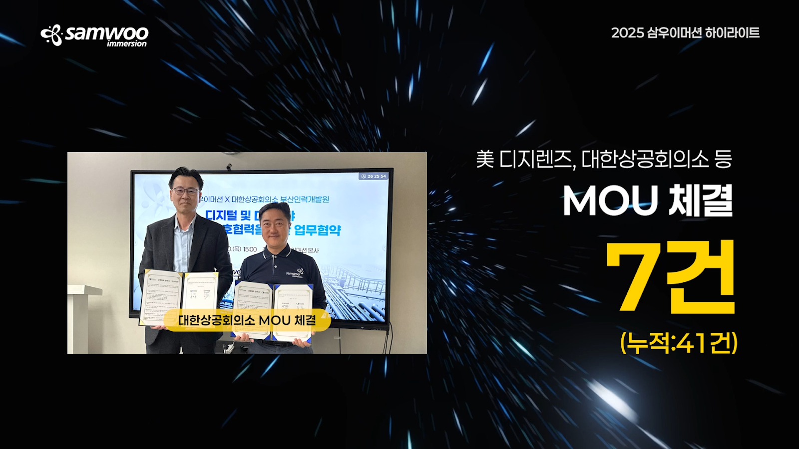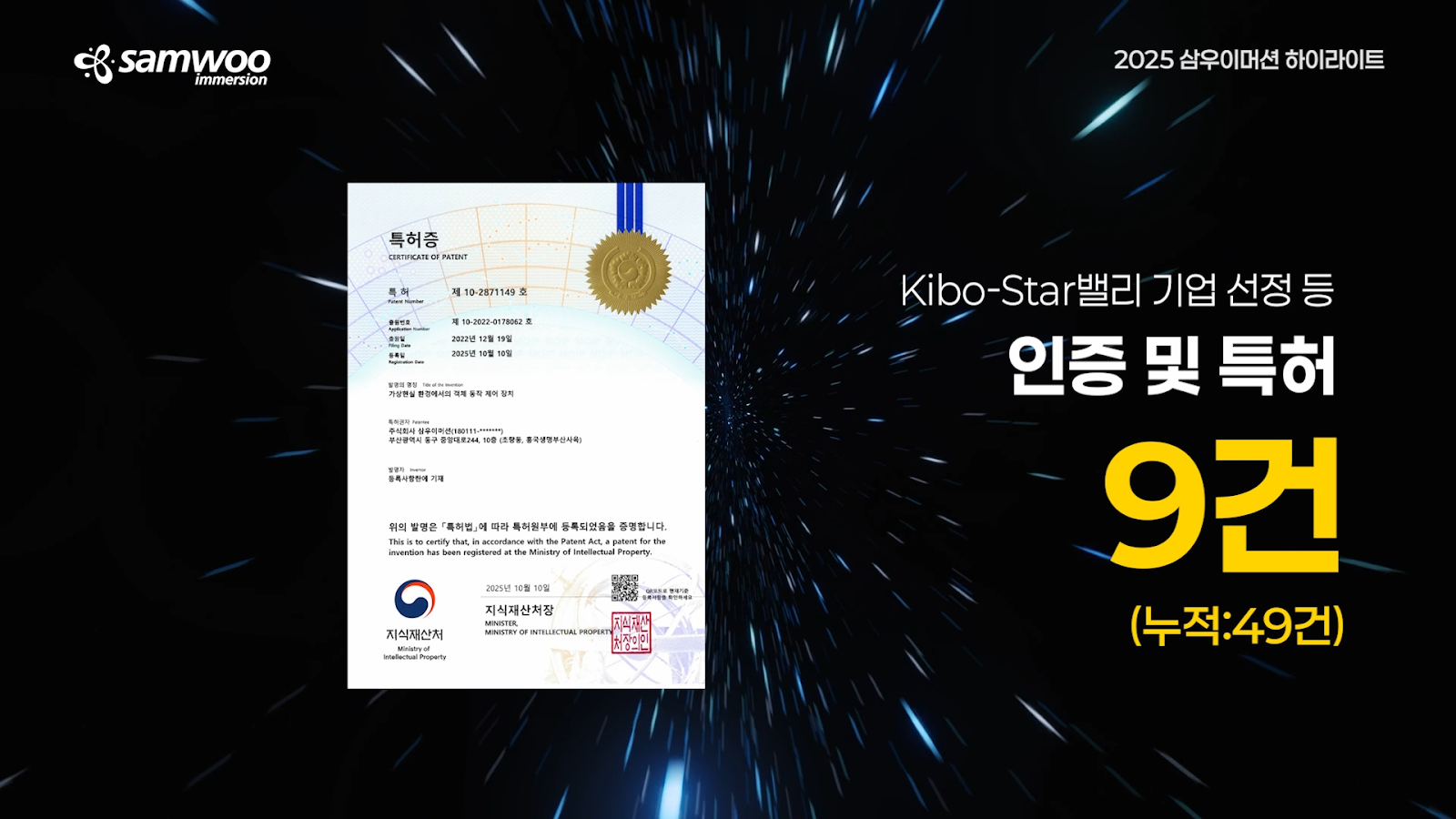 2025년 한 해 동안 삼우이머션은 XR·AI 기반 기술을 중심으로 다양한 성과를 만들어 왔습니다. MOU 체결 7건, 인증 및 특허 9건, 전시·박람회 운영 12건, 삼우이머션 방문 11건을 기록하며 기술력과 신뢰도를 현장에서 축적해 왔습니다. 📄